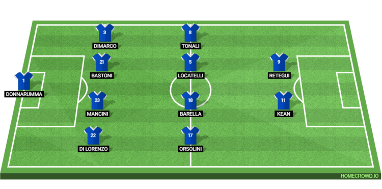Probable Lineup (4-4-2): Donnarumma; Di Lorenzo, Mancini, Bastoni, Dimarco; Orsolini, Barella, Locatelli, Tonali; Kean, Retegui