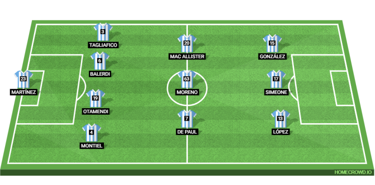 Probable Lineup (4-3-3): Martinez; Montiel, Otamendi, Balerdi, Tagliafico; De Paul, Moreno, Mac Allister; Gonzalez, Simeone, Lopez