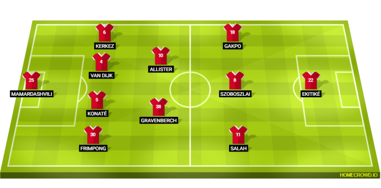Predicted Liverpool XI: Mamardashvili; Frimpong, Konate, van Dijk, Kerkez; Gravenberch, Mac Allister; Salah, Szoboszlai, Gakpo; Ekitike