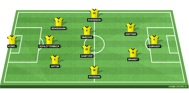 Probable Lineup (3-4-2-1): Kobel; Anton, Schlotterbeck, Bensebaini; Ryerson, Sabitzer, Nmecha, Svensson; Adeyemi, Brandt; Guirassy