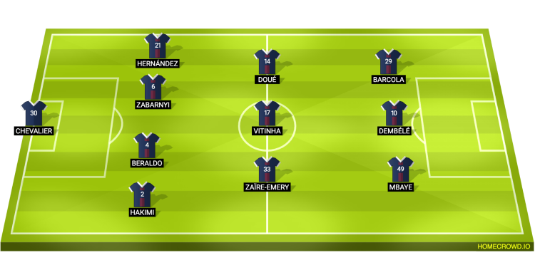Probable Lineup (4-3-3): Chevalier; Hakimi, Beraldo, Zabarnyi, Mendes; Zaire-Emery, Vitinha, Doue; Mbaye, Dembele, Barcola