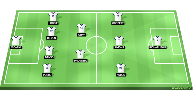 Probable Lineup (4-2-3-1): Vicario; Porro, Danso, Van de Ven, Udogie; Palhinha, Gray; Kudus, Simons, Odobert; Richarlison