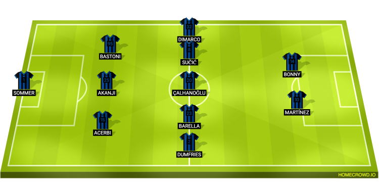 Probable Lineup (3-5-2): Sommer; Acerbi, Akanji, Bastoni; Dumfries, Barella, Calhanoglu, Susic, Dimarco’ Martinez, Bonny