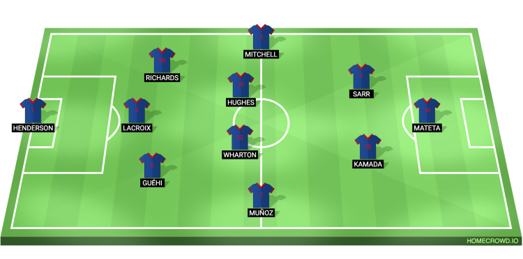 Probable Lineup (3-4-2-1): Henderson; Guehi, Lacroix, Richards; Munoz, Hughes, Wharton, Mitchell; Kamada, Sarr; Mateta