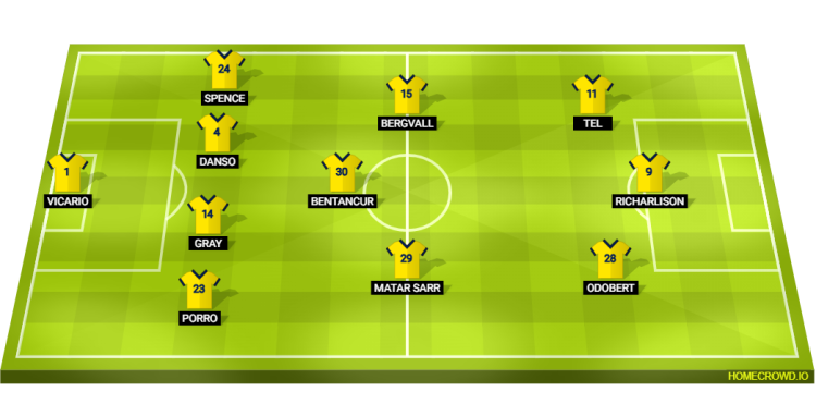 Probable Lineup (4-3-3): Kinsky; Porro, Gray, Danso, Spence; Sarr, Bentancur, Bergvall; Odobert, Richarlison, Tel