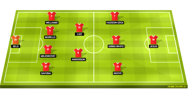 Probable Lineup (4-2-3-1): Sels; Savona, Milenkovic, Murillo, Williams; Anderson, Luiz; Ndoye, Gibbs-White, Hudson-Odoi; Jesus