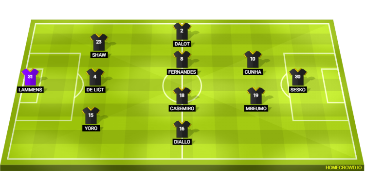 Probable Lineup (3-4-2-1): Lammens; De Ligt, Maguire, Shaw; Amad, Casemiro, Fernandes, Dalot; Mbeumo, Cunha; Sesko
