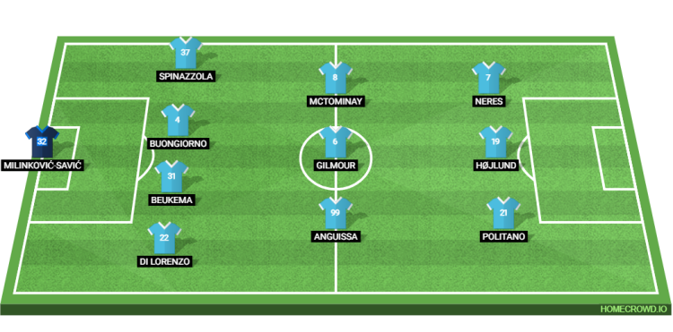 Probable Lineup (4-3-3): Milinkovic-Savic; Di Lorenzo, Beukema, Buongiorno, Spinazzola; Anguissa, Gilmour, McTominay; Politano, Højlund, Neres