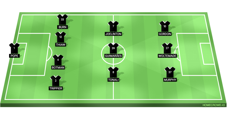 Kieran Trippier and Dan Burn will start as the full-backs. The wide duo will look to help out at both ends of the pitch. Sven Botman and Malick Thiaw will start in the heart of the defence for the away side.