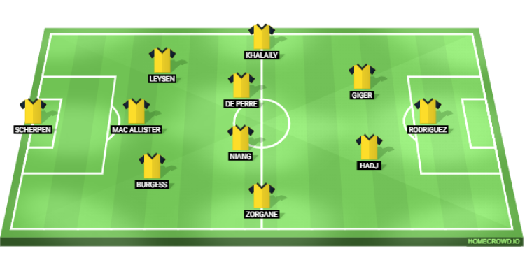 Probable Lineup (3-4-2-1): Scherpen; Mac Allister, Burgess, Leysen; Niang, De Perre, Zorgane, Khalaily; Hadj, Giger; Rodriguez