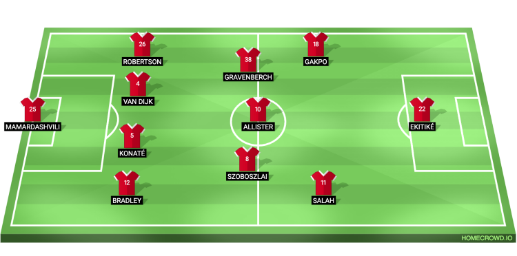 Predicted Liverpool XI: Mamardashvilli, Bradley, Konate, van Dijk, Robertson; Szoboszlai, Gravenberch, Mac Allister; Salah, Gakpo; Ekitike
