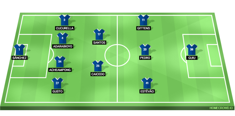 Predicted Chelsea XI: Sanchez; Gusto, Acheampong, Adarabioyo, Cucurella; Caicedo, Santos; Estevao, Joao Pedro, Gittens; Guiu