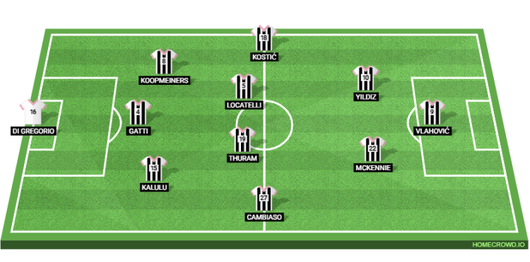 Probable Lineup (3-4-2-1): Di Gregorio; Kalulu, Gatti, Koopmeiners; Cambiaso, Thuram, Locatelli, Kostic; McKennie, Yildiz; Vlahovic