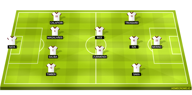 Probable Lineup (4-2-3-1): Raya; Timber, Saliba, Gabriel, Calafiori; Zubimendi, Rice; Saka, Eze, Trossard; Merino