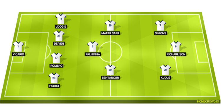 Probable Lineup (4-3-3): Vicario; Porro, Romero, van de Ven, Spence; Bentancur, Palhinha, Sarr; Kudus, Richarlison, Simons