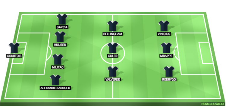 Probable Lineup (4-3-3): Courtois; Alexander-Arnold, Militao, Huijsen, Garcia; Valverde, Guler, Bellingham; Rodrygo, Mbappe, Vinicius Junior