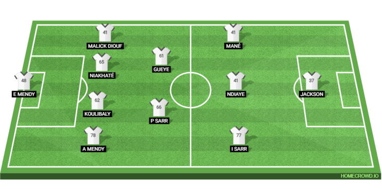 The double pivot is likely to feature Pape Matar Sarr and Idrissa Gueye, offering ball-winning ability and forward thrust from midfield. Ahead of them, the attacking trio should consist of Ismaila Sarr on the right wing, Iliman Ndiaye as the central playmaker, and Sadio Mane coming in from the left flank with licence to drift into central areas.