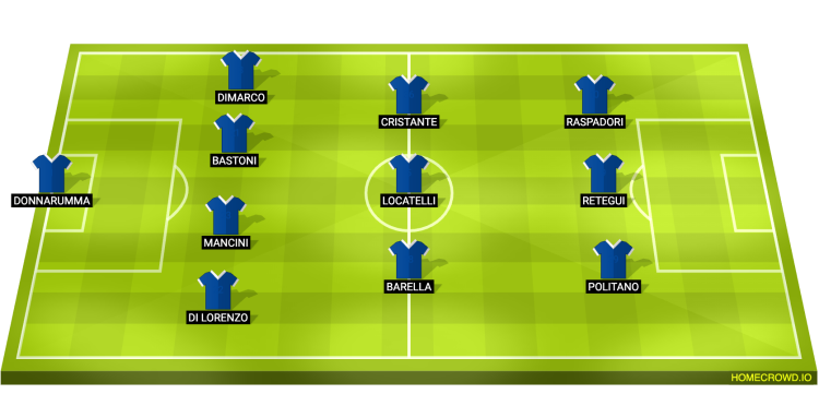 Probable Lineup (4-3-3): Donnarumma; Di Lorenzo, Mancini, Bastoni, Dimarco; Barella, Locatelli, Cristante; Politano, Retegui, Raspadori