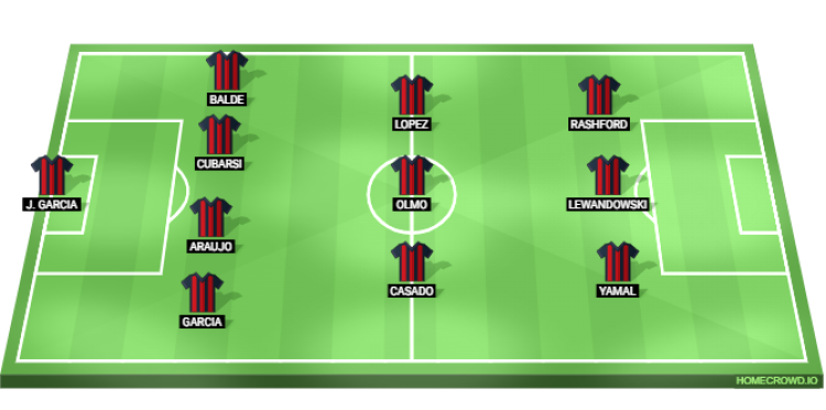Probable Lineup (4-3-3): Joan Garcia; Garcia, Araujo, Cubarsi, Balde; Casado, Olmo, Lopez; Yamal, Lewandowski, Rashford