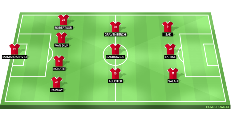 Probable Lineup (4-3-3): Mamardashvilli, Ramsay, Konate, van Dijk, Robertson; Szoboszlai, Mac Allister, Gravenberch; Salah, Ekitike, Isak