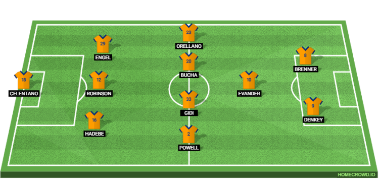 Probable Lineup (3-4-1-2): Celentano; Hadebe, Robinson, Engel; Powell, Gidi, Bucha, Orellano; Evander; Brenner, Denkey