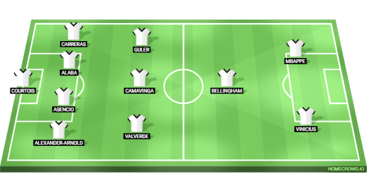 Predicted Real Madrid XI: Courtois; Alexander-Arnold, Asencio, Alaba, Carreras; Valverde, Camavinga, Guler; Bellingham; Vinicius Junior, Mbappe