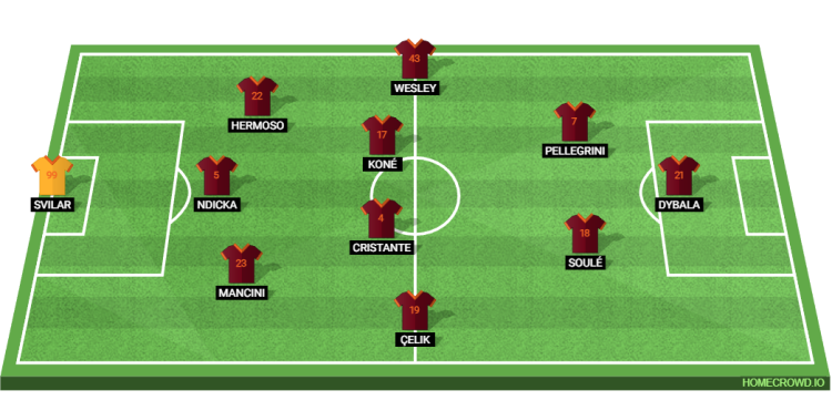 Probable Lineup (3-4-2-1): Svilar; Mancini, Ndicka, Hermoso; Celik, Cristante, Kone, Wesley; Soule, Pellegrini; Dybala
