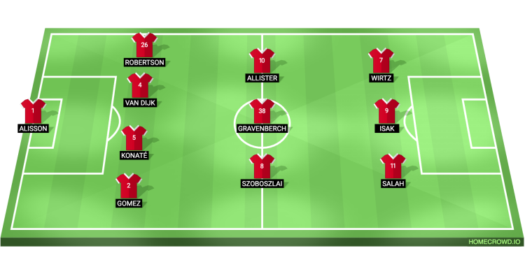 Probable Lineup (4-3-3): Alisson; Gomez, Konate, van Dijk, Robertson; Szoboszlai, Gravenberch, Mac Allister; Salah, Isak, Wirtz