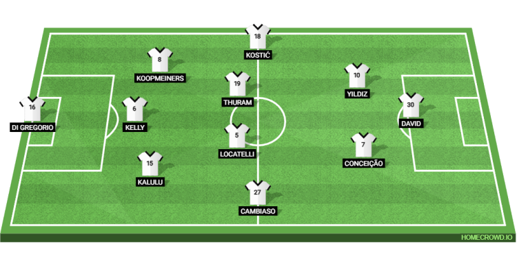 Probable Lineup (3-4-2-1): Di Gregorio; Kalulu, Kelly, Koopmeiners; Cambiaso, Locatelli, Thuram, Kostic; Conceicao, Yildiz; David