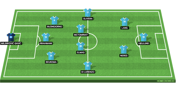 Probable Lineup (3-4-2-1): Milinkovic-Savic; Beukema, Rrahmani, Buongiorno; Di Lorenzo, Elmas, McTominay, Olivera; Neres, Lang; Hojlund