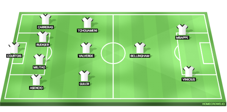 The team in white should line up in a 4-3-1-2 formation, where Thibaut Courtois will continue in goal. Raul Asencio and Alvaro Carreras are expected to be the full-backs, while Eder Militao will continue to partner Antonio Rudiger in central defence.