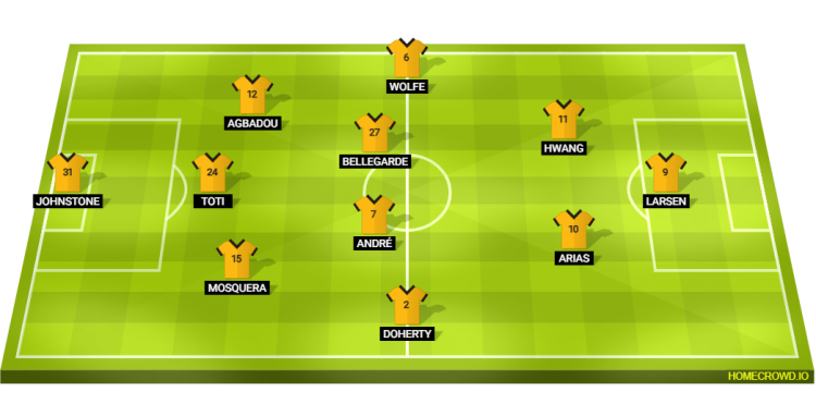 Probable Lineup (3-4-2-1): Johnstone; Mosquera, Toti, Agbadou; Doherty, Andre, Bellegarde, Wolfe; Arias, Hwang; Larsen