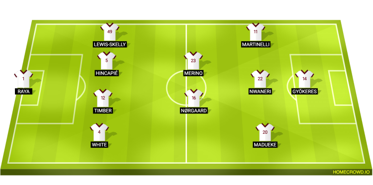 Predicted Arsenal XI: Raya; White, Timber, Hincapie, Lewis-Skelly; Norgaard, Merino; Madueke, Nwaneri, Martinelli; Gyokeres