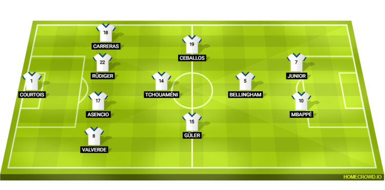 Predicted Real Madrid XI: Courtois; Valverde, Asencio, Rudiger, Carreras; Guler, Tchouameni, Camavinga; Bellingham; Mbappe, Vinicius Junior