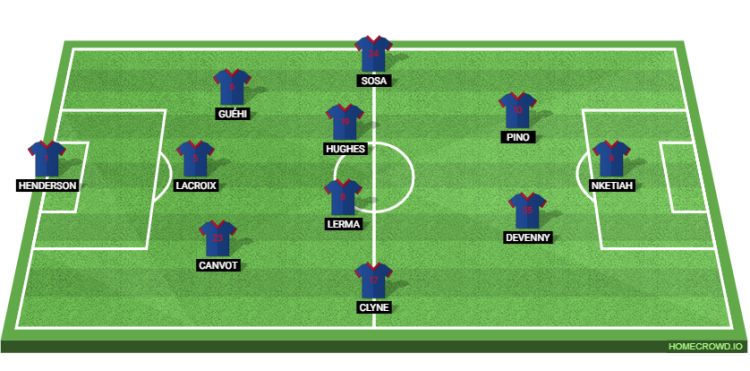Probable Lineup (3-4-2-1): Henderson; Canvot, Lacroix, Guehi; Clyne, Lerma, Hughes, Sosa; Devenny, Pino; Nketiah