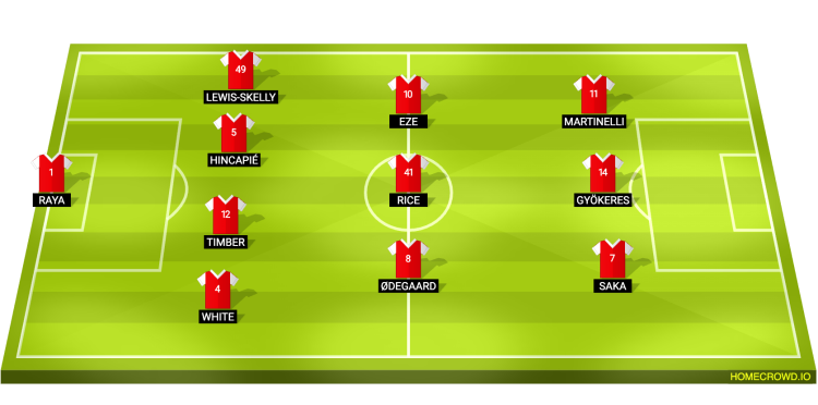 Probable Lineup (4-3-3): Raya; Ben White, Timber, Hincapie, Lewis-Skelly; Odegaard, Rice, Eze; Saka, Gyokeres, Martinelli