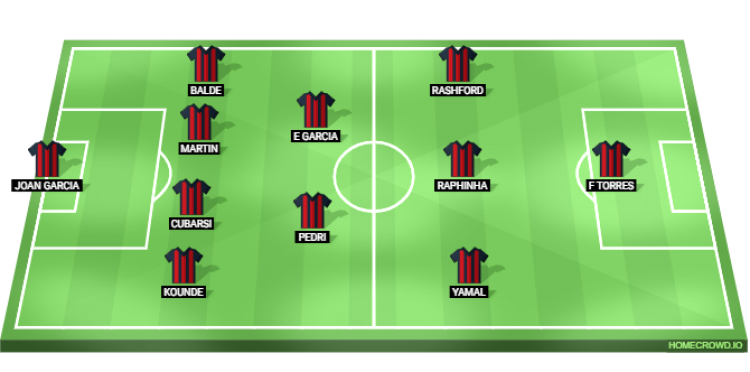 Probable Lineup (4-2-3-1): Joan Garcia; Kounde, Cubarsi, Martin, Balde; Pedri, Eric Garcia; Yamal, Raphinha, Rashford; Ferran Torres