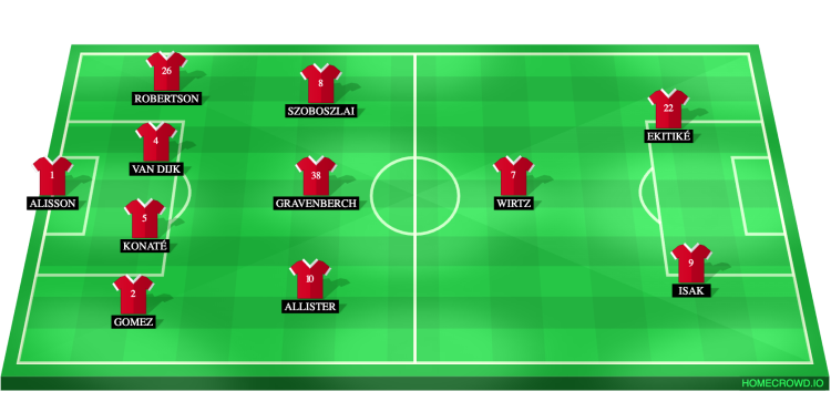 Probable Lineup (4-3-1-2): Alisson; Gomez, Konate, van Dijk, Robertson; Szoboszlai, Gravenberch, Mac Allister; Wirtz; Isak, Ekitike
