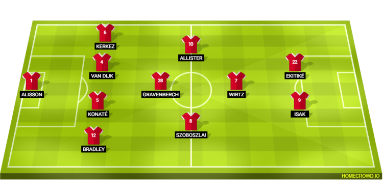 Predicted Liverpool XI: Alisson; Bradley, Konate, van Dijk, Kerkez; Szoboszlai, Gravenberch, Mac Allister; Wirtz; Isak, Ekitike
