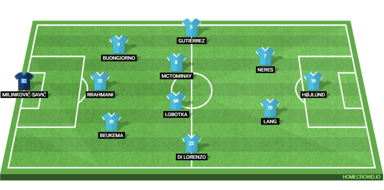Probable Lineup (3-4-2-1): Milinkovic-Savic; Beukema, Rrahmani, Buongiorno; Di Lorenzo, Lobotka, McTominay, Gutierrez; Lang, Neres; Hojlund