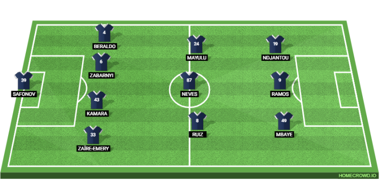 Probable Lineup (4-3-3): Safonov; Zaire-Emery, Kamara, Zabarnyi, Berlado; Mayulu, Neves, Ruiz; Mbaye, Ramos, Ndjantou