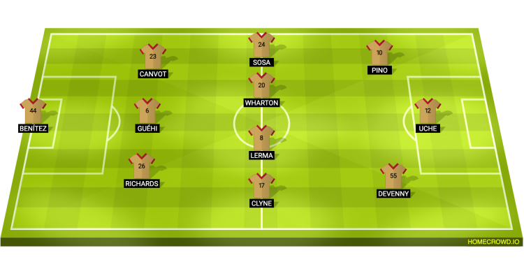 Probable Lineup (3-4-2-1): Benitez; Richards, Guehi, Canvot; Clyne, Lerma, Wharton, Sosa; Pino, Devenny; Uche