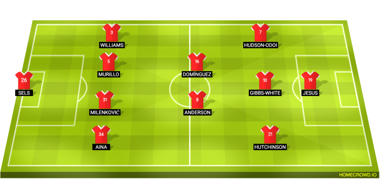 Probable Lineup (4-2-3-1): Sels; Aina, Milenkovic, Murillo, Williams; Anderson, Dominguez; Hutchinson, Gibbs-White, Hudson-Odoi; Jesus