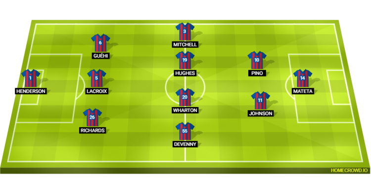 Probable Lineup (3-4-2-1): Henderson; Richards, Lacroix, Guehi; Devenny, Wharton, Hughes, Mitchell; Johnson, Pino; Mateta