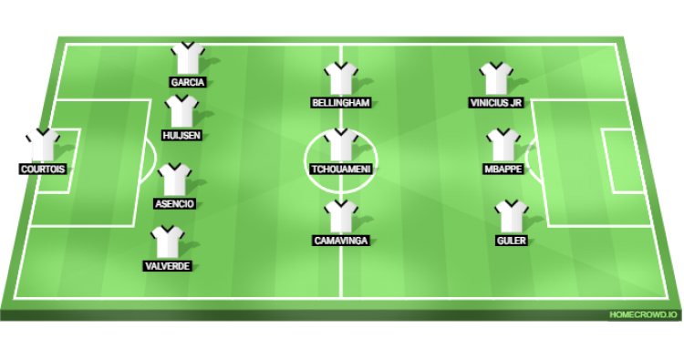 Probable Lineup (4-3-3): Courtois; Valverde, Asencio, Huijsen, Garcia; Camavinga, Tchouameni, Bellingham; Guler, Mbappe, Vinicius Jr