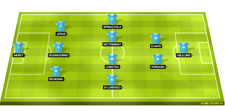 Probable Lineup (3-4-2-1): Meret; Beukema, Buongiorno, Juan Jesus; Di Lorenzo, Lobotka, McTominay, Spinazzola; Vergara, Elmas; Hojlund