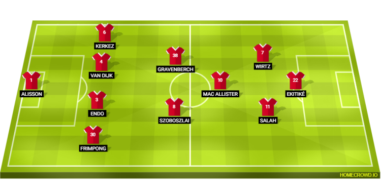 Predicted Liverpool XI: Alisson; Frimpong, Endo, van Dijk, Kerkez; Szoboszlai, Gravenberch; Salah, Mac Allister, Wirtz; Ekitike