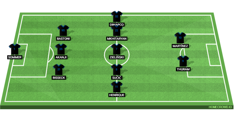 Probable Lineup (3-5-2): Sommer; Bisseck, Akanji, Bastoni; Henrique, Sucic, Zielinski, Mkhitaryan, Dimarco; Thuram, Martinez