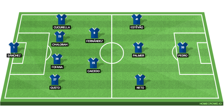 Predicted Chelsea XI: Sanchez; Gusto, Fofana, Chalobah, Cucurella; Caicedo, Fernandez; Estevao, Palmer, Neto; Joao Pedro
