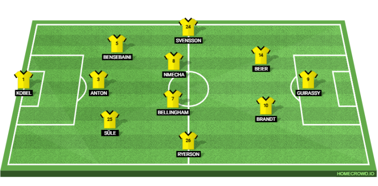 Probable Lineup (3-4-2-1): Kobel; Sule, Anton, Bensebaini; Ryerson, Bellingham, Nmecha, Svensson; Brandt, Beier; Guirassy